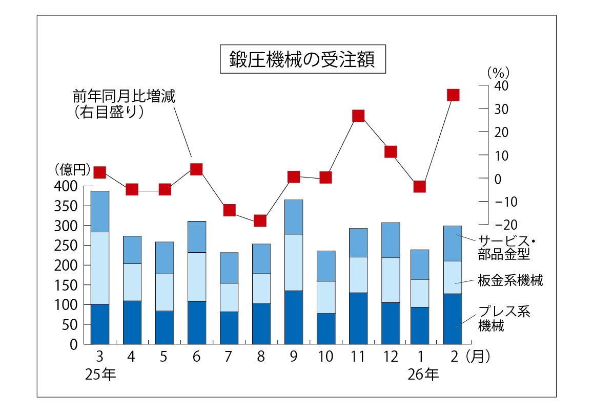 (一社)日本鍛圧機械工業会(代表理事会長=磯部任・アマダ会長)が3月10日発表した2月の鍛圧機械受注額(プレス系、板金系機械およびサービス・部品金型)は前年同月比36.7%増の298億7600万円と2カ月ぶりに増加した。プレス系機械が大幅に増え、板金系・サービス系がプラスだった。工業会は「超大型プレスの輸出が2.9倍と大きくけん引したうえ、国内もプレス系・板金系・サービス系がいずれもプラスだった。中東情勢のリスクがどう影響してくるか注視したい」としている。