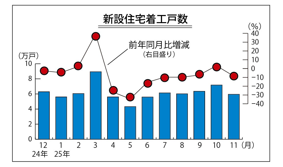 国土交通省が12月25日発表した11月の新設住宅着工戸数は5万9524戸だった。持家、貸家、分譲住宅が減ったため全体で前年同月比8.5%減と2カ月ぶりに減少した。季節調整済年率換算値は前月比10.6%減の71万8千戸と3カ月ぶりに減少した。