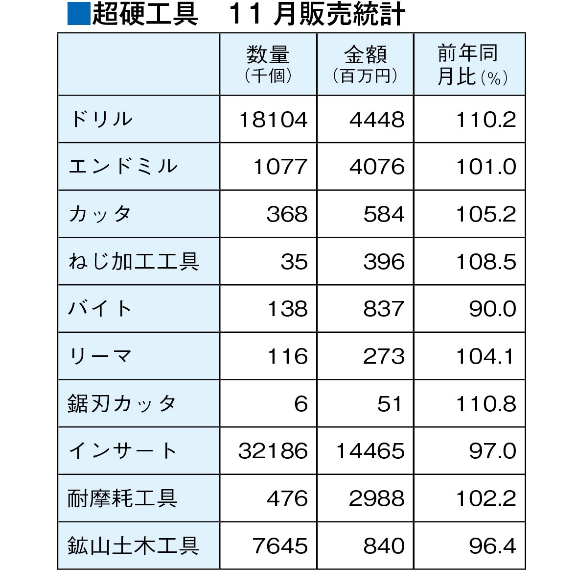 (一社)日本機械工具工業会が発表した11月の会員統計によると、切削工具、耐磨耗工具、鉱山土木工具の生産額は前年同月比0・6%減の402億3400万円、販売額は4.0%増の423億9400万円だった。