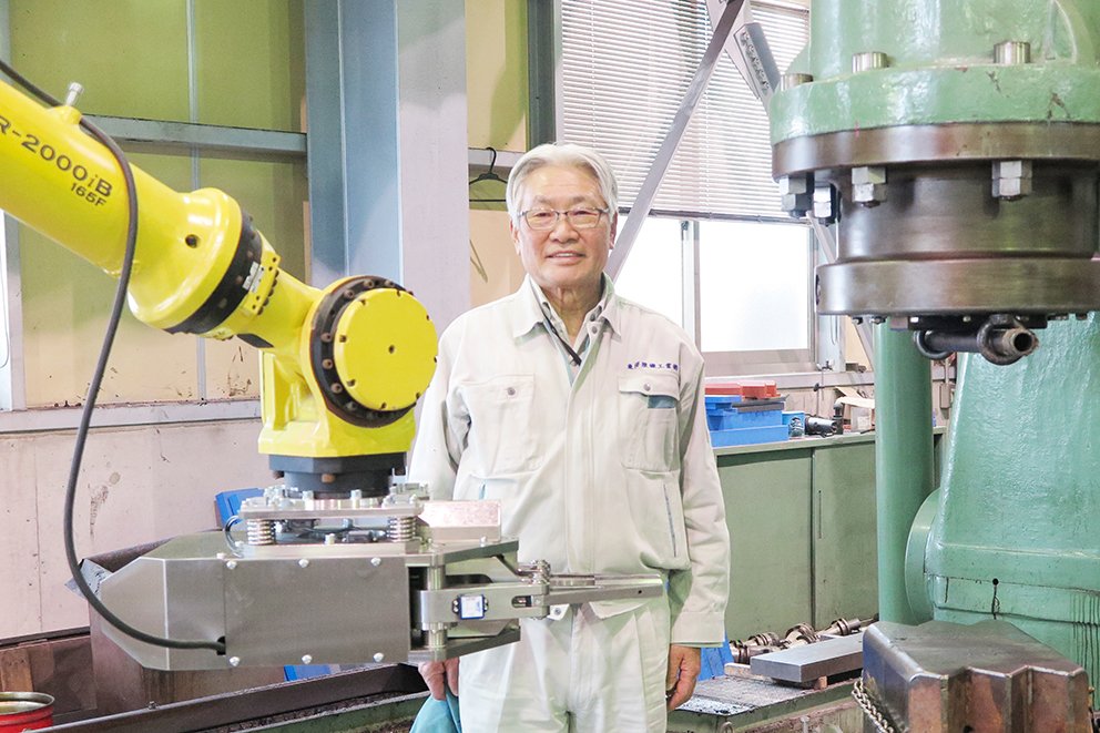 「1984年に、3Kの中でも特に熱さが厳しい熱間鍛造のロボット分野に参入しました。高温環境はSIerとしては敬遠したがる分野です。ワーク(加工対象物)は1250℃にも達し、工程ごとに形が変わるワークを一つのハンドで対応するのも非常に難しい。炉に突っ込むロボットのハンドは900℃の高熱にさらされます。いかに耐久性を高め、ハンドを冷却するかが重要になります。もし高温環境でロボットが停止すれば、ハンドに大きなダメージを受ける恐れがあるからです」