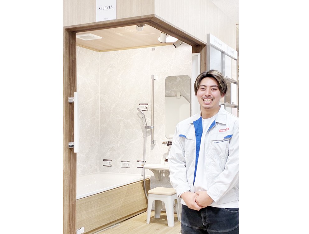 クリナップのシステムバスの魅力を語ってくれた嘉山心さんと嘉山さんが施工したクリナップ・東京北ショールームのシステムバス「SELEVIA」。1418サイズや梁を避ける切り欠き施工にも対応し、戸建だけでなくマンションにも対応できるようになった。嘉山さんによると戸建てとマンションの比率は「従来は7対3くらいでしたが、現在は半々くらい。マンションが続く時も多い」と、市場のニーズもしっかりと捉えている。
