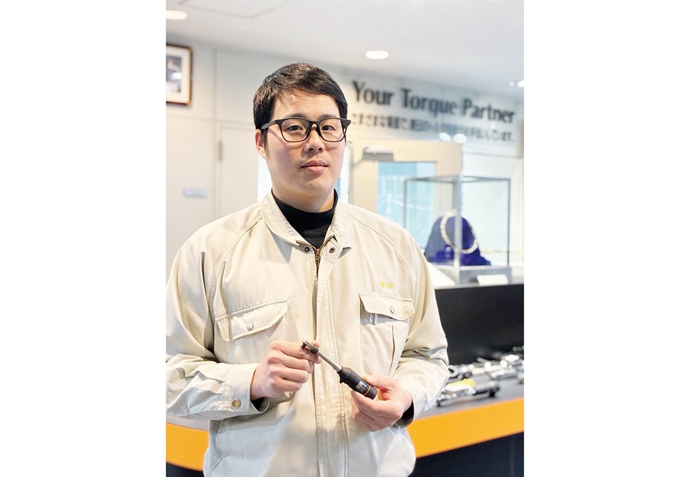 プリセット形トルクレンチ「QL+/CL+シリーズ」を開発した技術部 MT機器グループ 係長の仲佐大樹さん。趣味は職場仲間とのゴルフ。「アベレージ80台前半」が近頃の目標となっている
