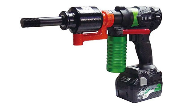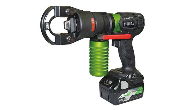 バッテリーの充電時間は25分で90㎟のメッセンジャーワイヤーを250本切断できます(新品バッテリー使用時)。メッセンジャーワイヤーは90㎟、30㎟、22㎟、鋼芯入りのアルミ線は120㎟、32㎟、スクリューアンカー棒は最大直径20㎜までの切断能力を備えます。ヘッドとモータ部は360°回転構造により角度を自由に調整可能、リリースレバーを搭載しており、噛み込み時でも油圧の解除が可能です。使い勝手がよくスピーディーな切断で、作業時間の短縮化を図れます。別売りのACアダプタでAC100V使用も可能で連続作業にも対応できます。