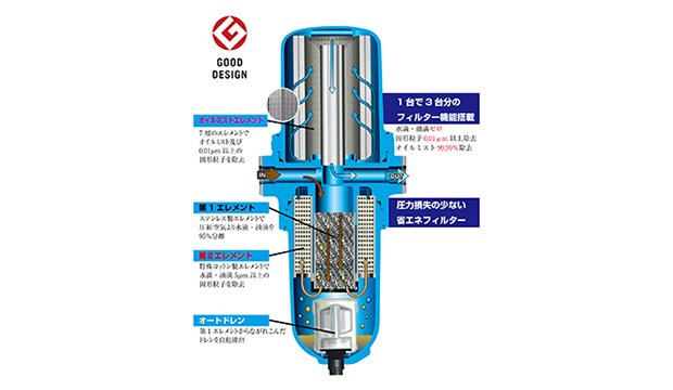 圧縮空気に含まれる0.01μm以上の固形粒子、オイルミスト、細菌、カビ等を除去する「抗菌・除菌3in1マルチ・ドライフィルタースケルトン」をモデルチェンジしました。抗菌処理を施したエレメントと、細菌を捕捉する除菌エレメントなどの特長を生かし、景況に左右されにくい「三品業界」で実績を伸ばしています。3台分のフィルター機能を備えている同製品の特長は、透明ポリカーボネイトボディを採用したことです。エレメントの汚れを目視確認できることから、衛生管理を重視する食品業界を中心に2005年11月の発売から累計9000台の実績を重ねてきました。