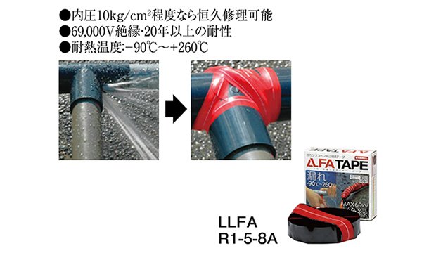 配管の漏れ(エアー・水・スチーム・ガス)を自己融着力のあるLLFAテープを巻くことにより短時間で簡単に漏れを止めることができます。