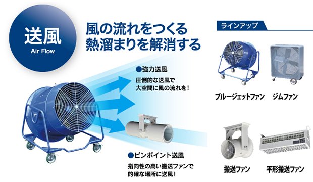 ブルージェットファン、ジムファン、搬送ファン、エアカーテン、ユニットヒータ
