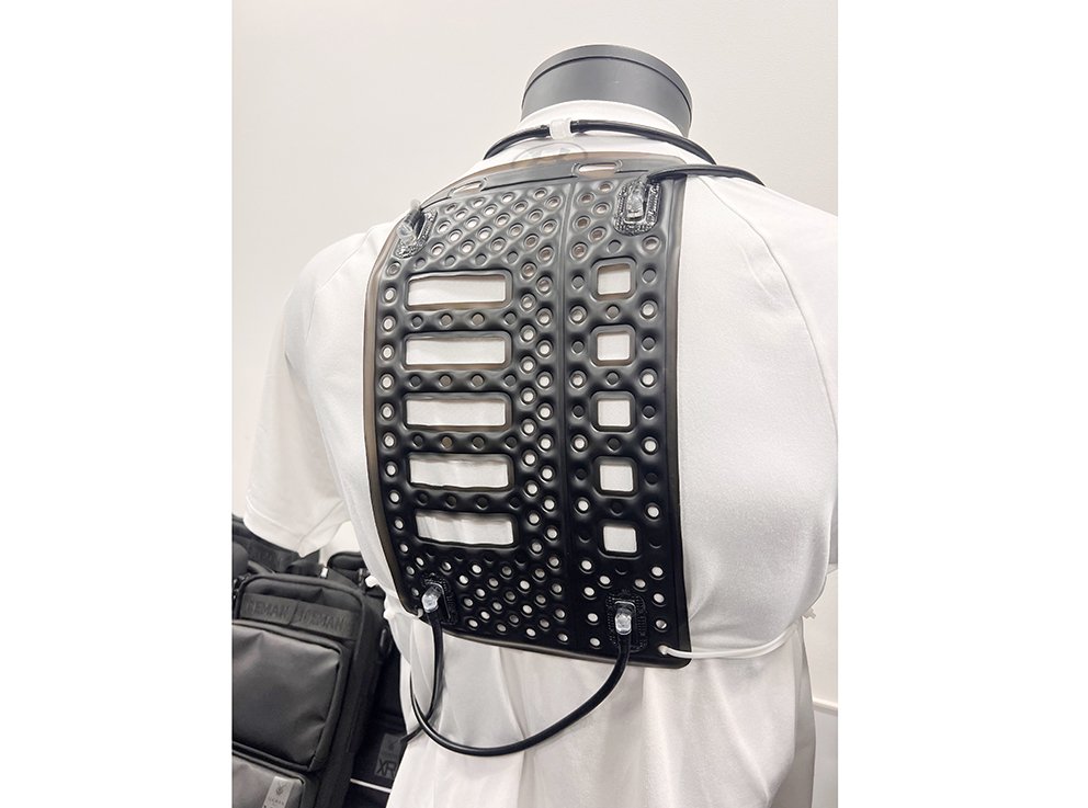 チャージボトルには全面に保冷生地を巻き、循環水が流れる部分のみ熱伝導率の高いアルミ材を採用することで、保冷性能と冷却効率を両立。循環方式も従来の服全体にチューブを巡らせる方式から、独自開発のシートを背中と前身頃に配置する形に改めた。シートは無数の穴を開け水路を細分化することで、「面」での冷却と循環に必要な水量の抑制を実現し、装着感の改善と冷却の安定化を図った。加えて、電源を切ると水が自然とシートから排出される仕組みのため、シーズンオフに水が残る衛生課題も軽減する。
