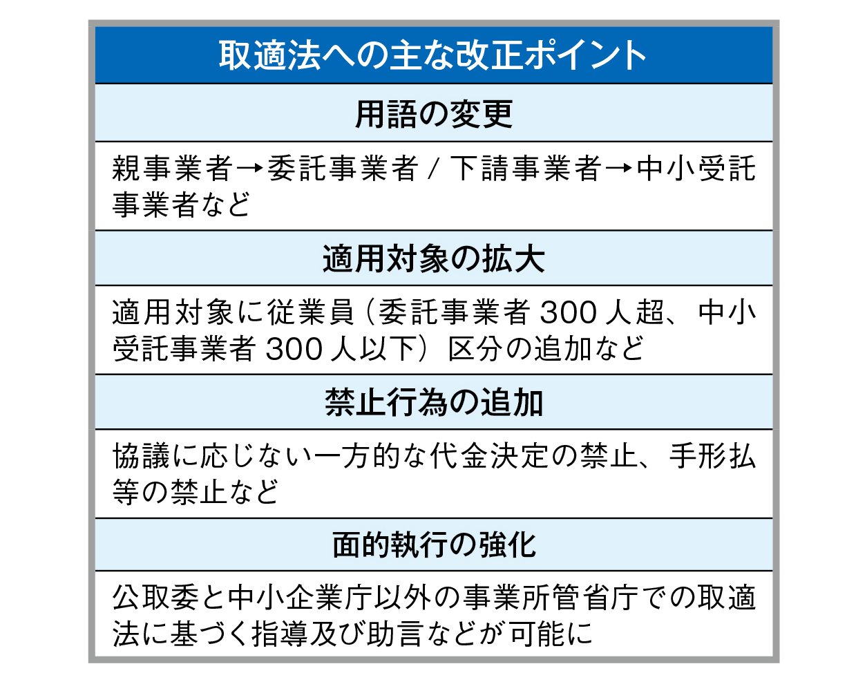 「下請法」が改正され、1月1日から新たに「製造委託等に係る中小受託事業者に対する代金の支払の遅延等の防止に関する法律(略称:中小受託取引適正化法、通称:取適法)」が施行された。対象取引の拡大や禁止行為の追加など、中小企業の適切な価格転嫁を促し、賃上げの原資確保につなげる狙いがある。