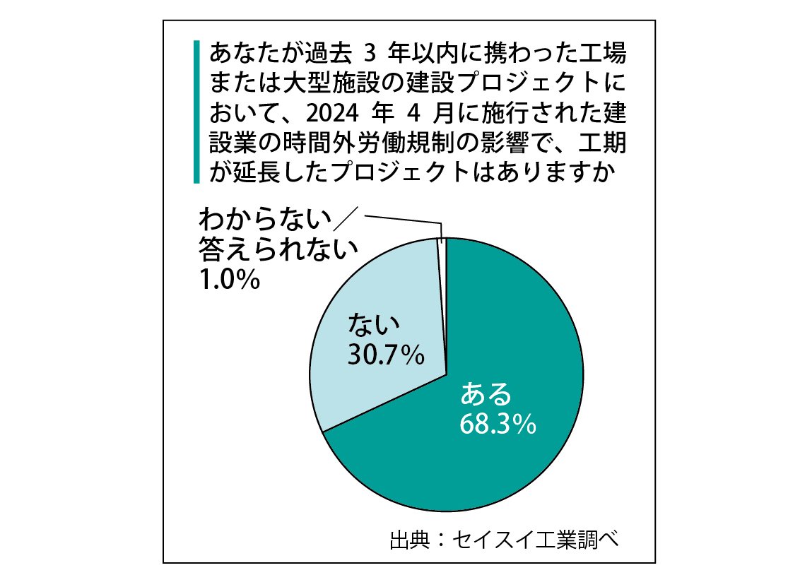 水処理・汚泥処理を手掛けるセイスイ工業は、ゼネコンまたは専門工事業に勤め、営業・工事監理・施工管理・設備担当として、過去3年以内に工場や大型施設の建設プロジェクトに関わった主任以上の101人を対象に、建設業の2024年問題が工場・施設建設に与える影響調査(2025年12月8日~10日、インターネット調査)を実施。工場・大型施設建設に携わる担当者の約7割が、時間外労働規制により工期延長を経験していることなどがわかった。