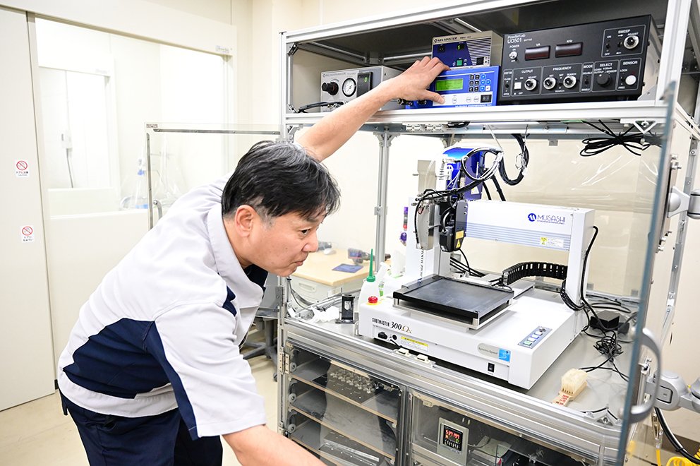 ベースとしたのは武蔵エンジニアリングの高性能卓上門型ロボット「SM300OMEGAX-3A-SSSM」。これにディスペンサーとシリンジを組み合わせ、CAD・CAM制御によるオリジナルの七宝自動盛付機を開発した。