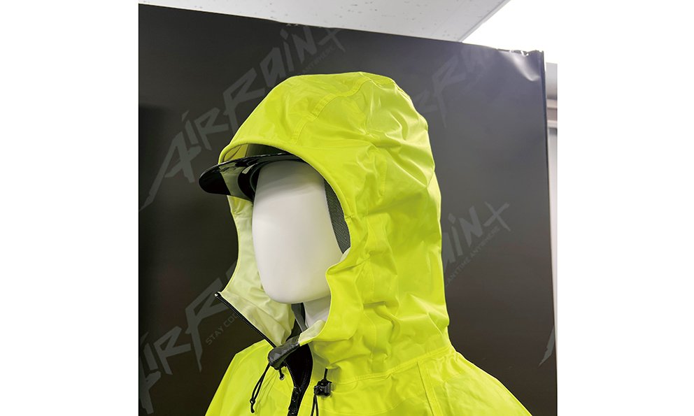 中でもイチオシなのが、独自開発の「マジックフード」を搭載した製品だ。従来の合羽はフードを被った状態で顔を左右に向けると、視線とフードの端が重なり「ブラインド」状態になってしまうことがあった。マジックフードは上下左右の顔の動きにフードが360度追従するため、首を振っても視界が遮られない。着用が努力義務化されているヘルメットにも対応しており、上からフードを被ることも可能だ。
