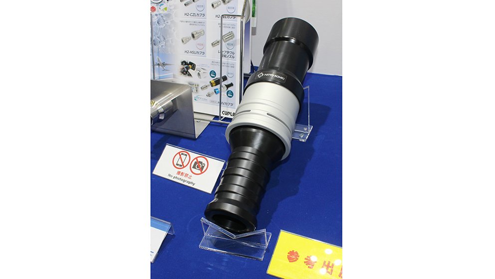 同社は高圧水素用の継手としてHHVカプラをラインナップし、乗用車など向けの70MPa仕様と、フォークリフトなど向けの35MPa仕様で構成。全国に約160カ所ある水素ステーションの半分で採用されているという。この継手の特長は接続して圧力がかかって初めて流路が開く構造にある。参考出品にもこの安全性をもたせた。