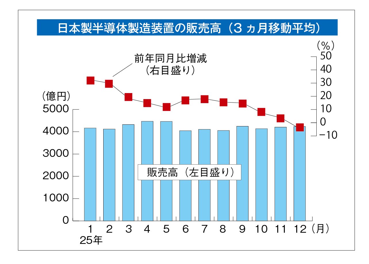 (一社)日本半導体製造装置協会(SEAJ、会長=河合利樹・東京エレクトロン社長CEO)が1月27日に発表した12月の日本製半導体製造装置の販売高(輸出を含む3カ月移動平均、速報値)は前年同月比4.5%減の4234億8700万円だった。24カ月ぶりに減少に転じた。一方で、前月比では0.7%増とプラスだった。