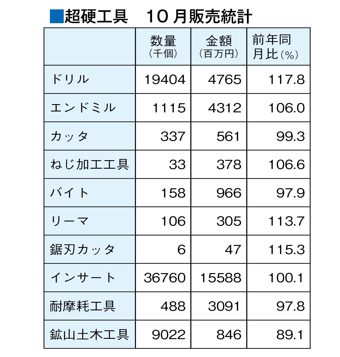 日本機械工具工業会 会員統計10月、超硬工具 6.7%増