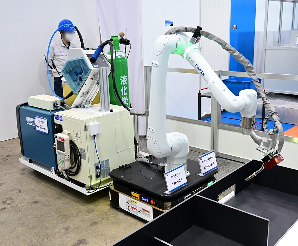 造船向け溶接用協働ロボットの展示も目についた。ダイヘンはともに今春発売したロボット「FD-VC8」(8キロ可搬)をAMR「AiTran500」に載せ、移動溶接できることを初めて披露した。その理由について「我々の溶接は自動車向けがメインだったが、EVシフトの停滞などもあり造船が次世代市場として有望になってきている」と話す。世界の造船市場は国際貿易の拡大や燃料多様化、軍事需要の拡大などを背景に2030年にかけて成長が続くと複数の調査会社が予測する(年成長率は3,5~5,5%程度)。